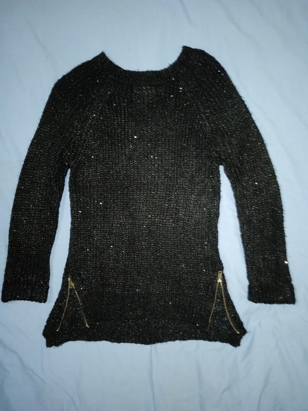 светр - туніка крупна в'язка з люрексом, дві блискавки внизу, оверсайз, довжина перед 70см, спина 75см, рукав від ворота 73см, по бирці s/m, але підійде на більше.30%вовни,70%акрила.стан ідеальний.