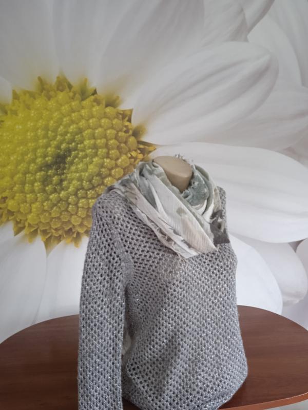 Стильна однотонна кофтинка з довгим рукавом сірого кольору. Прикрашена люрексом. Фактурна,ажурна в'язка. Тягнеться з легкістю. Тепла та зручна. Приємна на дотик. Лягає по фігурі. Фасон прямий. Акуратний виріз. Гарно виглядає з шарфом в тон у комплекті (шарф може бути замінений, але в кольорі). Є розміри.