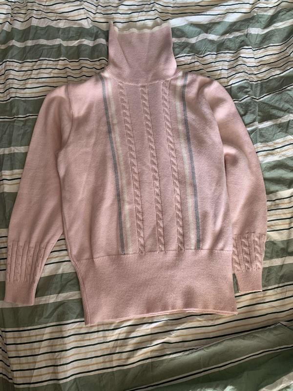 Дуже тепла кофта з якісної вовни , замерзнути не дасть, ніжно рожевого кольору, не вдягалась жодного разу, не колюча зовсім , як на мене. піде і на розмір S і на M Якість топова. плечі 40 груди ПО 48 довжина 61 рукав 55/39