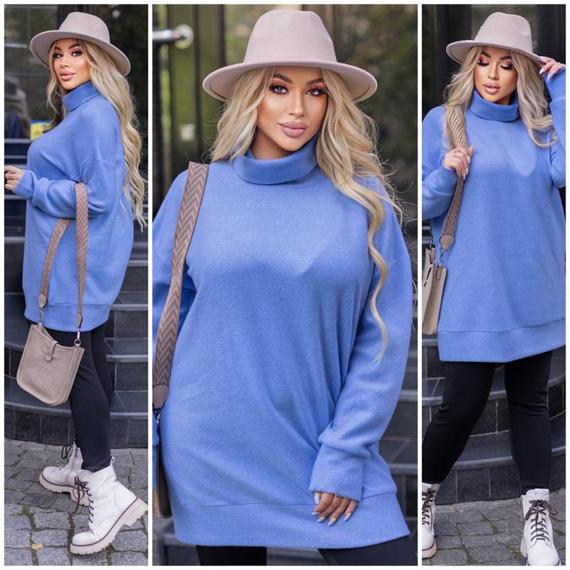Батал 48+ Подовжена вільна кофта з горлом із трикотажу Ангора. Сезон: осінь-зима 2022 Розміри: 48-50, 52-54, 56-60 Параметри: ОГ кофти / низ кофти / ширина рукава де шов : 48-50: 120/110/42 52-54: 130/120/44 56-60: 140/130/48 Довжина кофти по спинці/довжина рукава від горловини/ширина рукава де шов: 48-50: 78/70 52-54: 80/71 56-60: 84/72 10 кольорів: чорний, молочний, бежевий, малина, блакитний, зелений, гірчиця, рожевий, світло-сірий, графіт-темний. Тканина: трикотаж-Ангора. добре тягнеться. М'яка та приємна до тіла тканина! P.S. На моделях на фото розмір: 48-50 софиев вайб