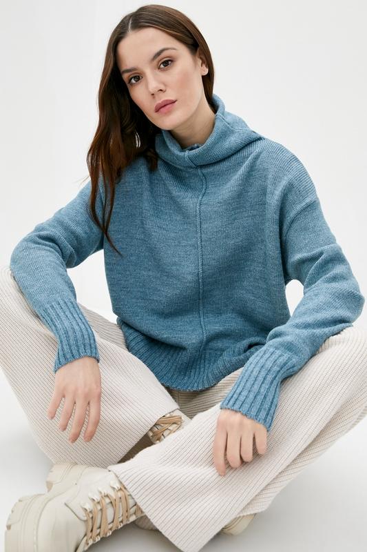 Просторный женский свитер с цельновязаным воротником хомут. Спущенные плечи. Изделие изготовлено из пряжи с добавлением шерсти и эластана, спереди декоративная полоса, широкие резинки по рукавам и низу.