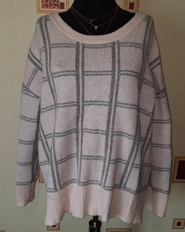 Теплий, об'ємний светрик ніжного кольору,м'ягкий та приємний до тіла,по бокам,знизу розрізи,розмір вказаний 12,підійде на М,С,стан дуже гарний
