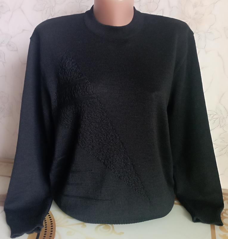 Базовый, Тепленький, мягкий, полушерстяной свитер насыщенного черного цвета, с однотонным принтом, плечи слегка спущены 43, ПОГ 52-56, ПИТ 50-54, рукав 56, длина изделия 57. Состояние новой вещи.