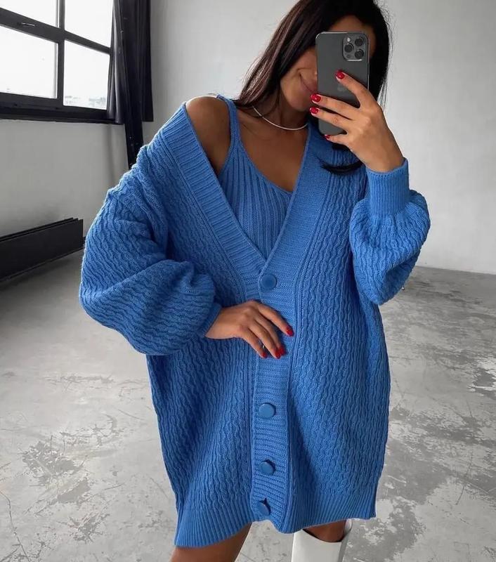 🍂В'язаний комплект-двійка (кардиган+майка )стане незамінним елементом базового гардеробу🍁.Актуальні відтінки поєднуються із будь-якими речами, а вільний крій підходить для будь-якого типу фігури👌 🎨Колір: синій, бежевий, зелений 🍃Матеріал:машинна в'язка 🍃Склад:акрил 100% ✔Розмір: універсальний ✔Заміри ⤵️ Ог 120 см, Довжина 90 см , Довжина майки 55 см. 💳Ціна:1490грн GH-9393 ❗❗Для замовлення та детальної інформації пишемо у дірект💌, або коментарі ⤵️