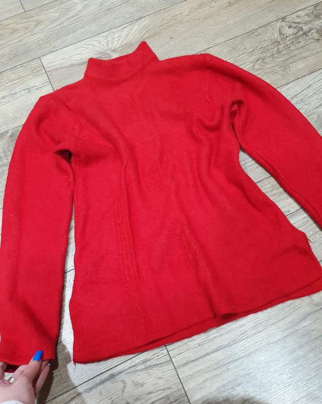 приємний до тіла, не колеться в ідеальному стані, без дефектів з горлом, теплющий розмір 42-46 підійде гарний насичений червоний колір бірки зі складом не має, але видно що в складі є шерсть, буде гріти