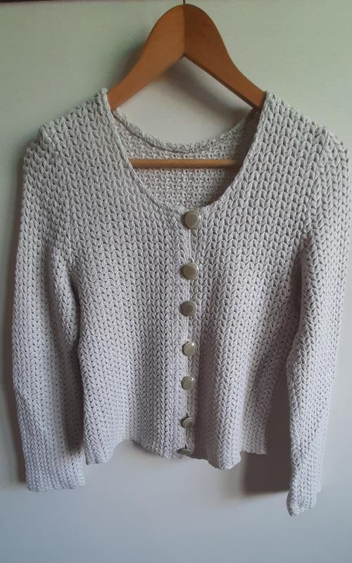 Світер фабричного фактурного в'язання на гудзики, сірий, приталений і до талії (короткий) в хорошому стані, не синтетичний (бавовна). Заміри: ПС 39см ПГ 42см ПТ 39см ПБ 45см Довжина 48см Довж. рукава поверху 56см Довж. рук. від пройми 41см Ширина рук. вгорі 14см Ширина рук. на запясті 11см