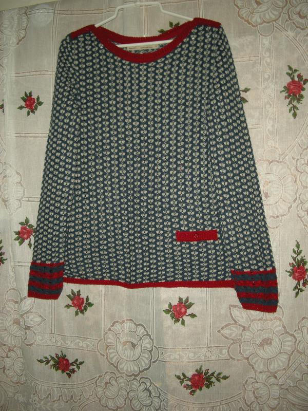Кофта красивой вязки-на темно-синем фоне белые тюльпанчики,ажурная сетка,фирменная,98%акрил,1%полиэстер,1%металик,вырез вокруг шеи и плечи сверху-манжет вишневого цвета и вплетенная блестящая нить,внизу с левой стороны карманчик-обманчик,низ кофты темно-вишневый,рукав длиной-71см.заканчивается манжетом темно-синим и вишневым,длина кофты-67см.