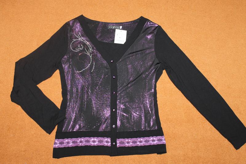 Гарна кофточка куплена в Європі,розмір 2 вказано, ярлик зі складниками відрізана,та на дотик віскоза з еластаном( чорного кольору) і поліестеровий трикотаж фіолетового кольору.Довжина-53см, плечі-39см, рукав від плеча-57см, пог-46см,пот-40см, поб-46см.