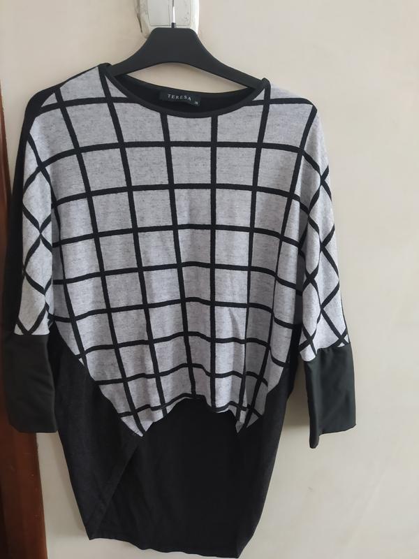 Красива туніка в клітинку з шкіряними рукавами та вставками. Видовжена ззаду. Тепленька, дуже приємна до тіла. Стан ідеальний