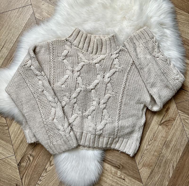 Кремовий светр крупної в’язки з плетінням спереду, високою горловиною. Оверсайз. Укорочений. Дуже теплий. Бренд Stradivarius. Розмір M. Із недоліків є незначні катишки. Стан 4/5.