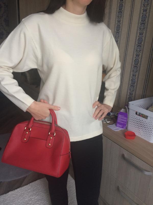 К прикосновению комфортный, приятный. Цвет молочный. Длина 63 см, ПОГ 50 см, внизу 53 см, плечи приспущенные 46 см, рукав - от горловины 66 см. . Одет на девушку рост 167, фигура 92х74х98 см .Состав: 50% шерсть, 50% акрил.