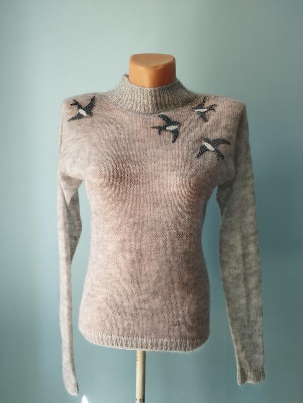 Свитер из итальянского мохера, мягкий, не колется с декором из чешского бисера. Все ручная работа. Размер s/m, плече приспущены, без проймы. Фото на теле, если надо, скину. Длина изделия- 58 см, объем груди- 42,5-43, но учитывайте, что это трикотаж, а он тянется.