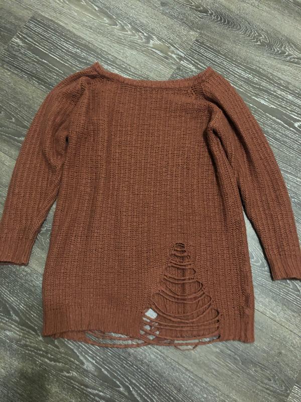 Светр з ефектом рванини, колір темно-цегловий, дуже м‘який та теплий. Склад: 80% бабовна, 20% вовна.