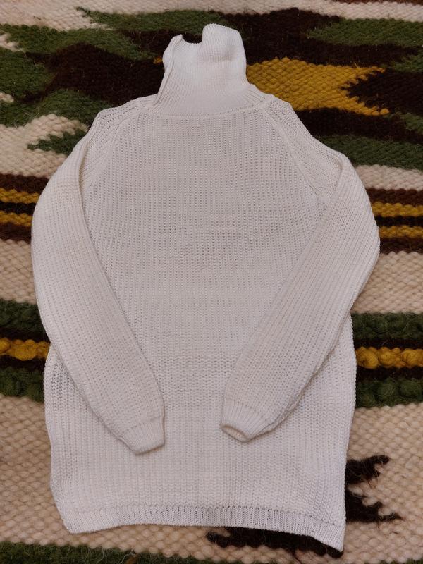 Теплий білосніжний светрик з високим горлечком, є розрізи з боків, дуже гарно тягнеться. Рукав- реглан , від горла 72 довжина від плеча до низу 67-68 напівобхват грудиє від 45 до 53 Стан нової речі. Не носився.