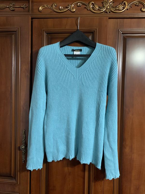 Джемпер Італія з віскози та ангори в рубчик бірюзового кольору. З цікавим оздобленням, потертостями ( рваностями ) по низу светра та по низу рукавів. В складі віскоза та 5% ангори. Новий. Розмір - L/Xl Добре тягнеться. Довжина светра - 61 см
