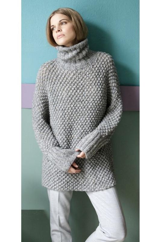 Подовжений светр з високим вільним коміром, об'ємної в'язки, сірого кольору. В ідеальному стані. В складі пряжі 23% мохеру. Пог 52 см. Ширина в плечах 56 см. Р 55 см. Д 78 см. Глибина пройми 20 см.