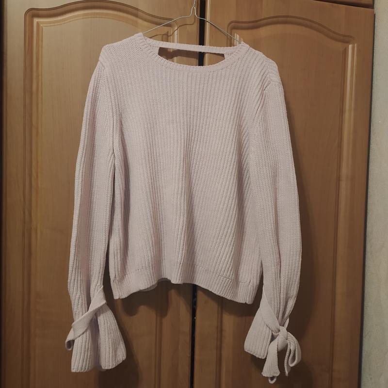 Нежно-розовый свитерок с интересными рукавами и спинкой, размер-46, 48. Присутствует нитка ангоры.