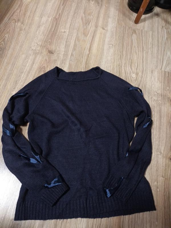 кофта светр темно-синього кольору, з атласними стрічками в рукавах, м'якенький на дотик, в дуже гарному стані.Без дефектів. Arjen