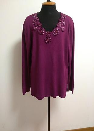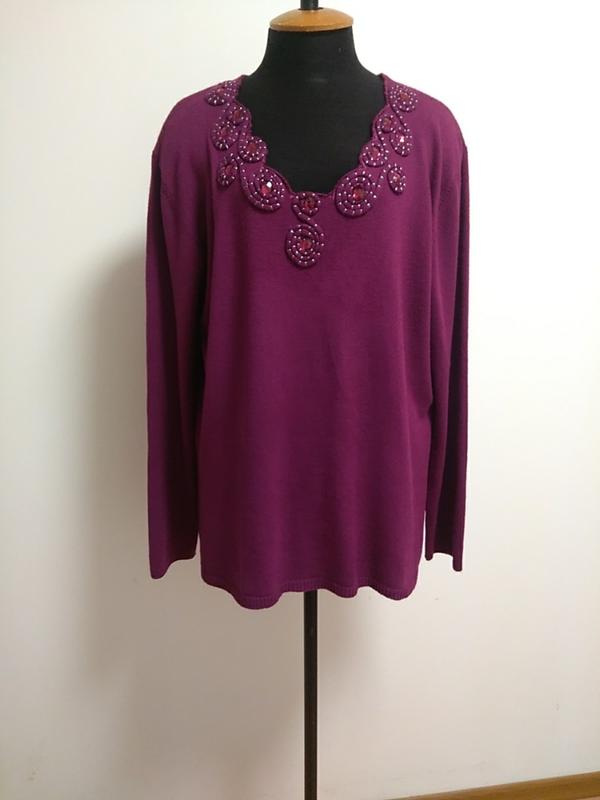 Мягкий комфортный свитерок. Отделка по воротнику трикотажным шнуром,люрексом и крупными камнями. Размер указан XL,но идёт и на большие,так как очень хорошо мягко тянется,можно на 2-3XL,точнее по замерам: длина 65 плечи 45 ПОГ 57,тянется до 90 ПОТ 52,тянется до 87 ПОБ низ 58,тянется до 100 длина рукава 58 высота проймы 25,тянется до 38 ПО бицепса 18,тянется до 28 ПО в локте 15,тянется до 25 ПО края рукава 11,5,тянется до 25 глубина выреза горловины спереди 15. Состав:70%вискоза/30%нейлон/полиамид - трикотаж мягкий,приятный к телу и хорошо тянется. Состояние очень хорошее. Самая точная цветопередача на первом фото - цвет бордово-филетовый,ближе к бордовому. Высылаю после полной оплаты. Автоматические заказы принимаются. Смотрите также другие мои объявления - много интересного и по доступным ценам. 🎉Інформацію про акції/знижки/розпродаж можна прочитати у розділі "Про мене"🤗