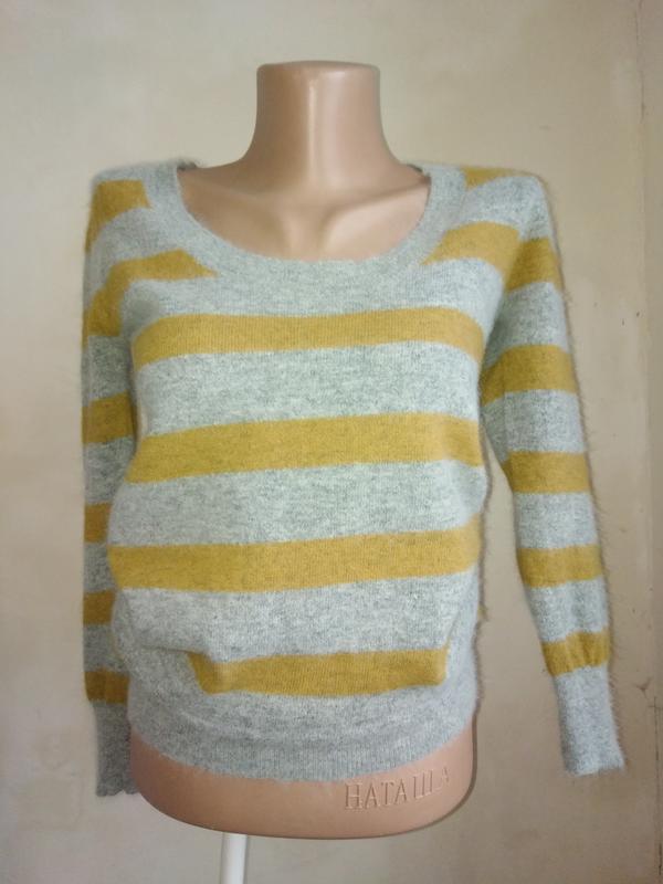 Разм 44-46, состав 54% нейлон, 40% ангора, 6% шерсть, очень легкий и мягкий.Цвет серый с горчичным. ПОГ - 40, ПОТ - 37, ПОБ - 40, длина - 68, рукав - 52, плечи - 36.