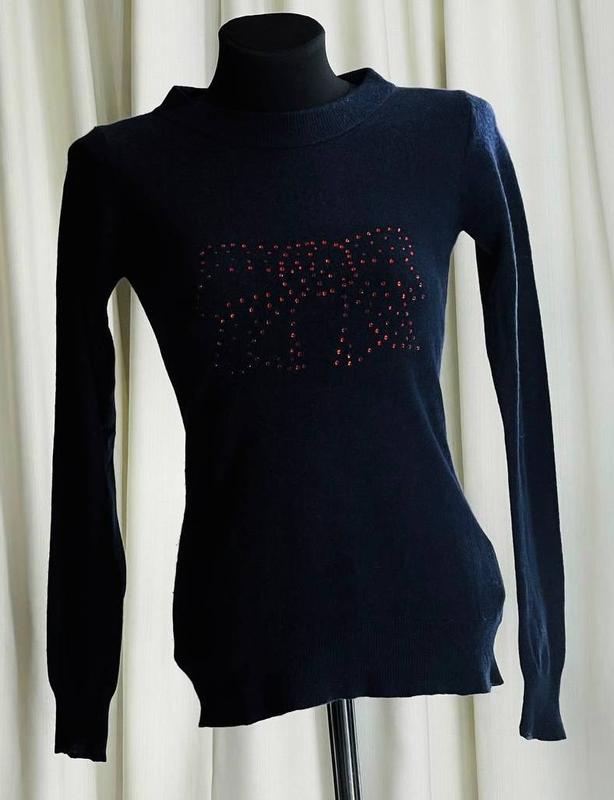 Невероятно теплый и мягкий женский кашемировый свитер темно-синего цвета с аппликацией стразами OVI🛍❤️🔥😍😍😍 Размер - UK 8-10/ EUR 36-38/ S-M / 44-46. Состав: 100% кашемир . Производство Китай . Свитер из тонкой и мягкой шерсти средней длины. Круглый невысокий воротник связанный резинкой . Низ свитера и манжеты рукава с высокой трикотажной резинкой . Связан гладью . На груди большая аппликация стразами красного цвета в виде банта. Дополнительные замеры: полная длина 63 см, ширина плеч 34 см, длина рукава 64 см, полуобхват груди 42 см ( полный обхват 84 см) и потянется до 100 см, полуобхват талии 40 см ( полный обхват 80 см) и потянется до 90 см, полуобхват резинки бедер 40 см ( полный обхват 80 см) и потянется до 110 см .