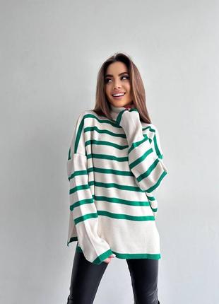 Свитер полоски с горлом Производство Турция 🇹🇷 Мелкая машинная вязка 77% акрил, 23% полиэстер Размер единый 42-48 Цвет зеленый, синий, капучино Фото наживо!