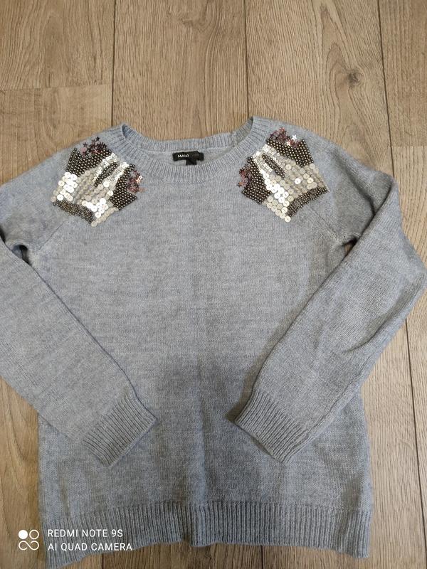 Mango светр шерстяний, натуралий, бірка зрізана но коли Ви його потрогаете то самі це зрозумієте, дуже гарний на плечах усі бусіни пришиті. По бірці розмір L, але насправді на S