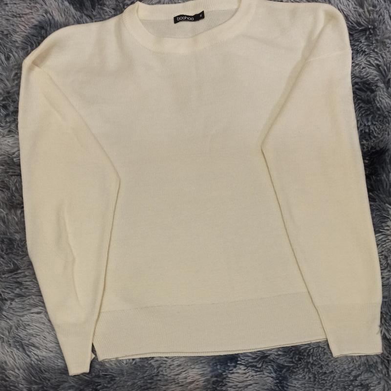Молочный свитер средней плотности, состояние нового. Размер указанного М, состав акрил. Замеры: ПОГ- 56, длина 62, рукав от горловины 72.
