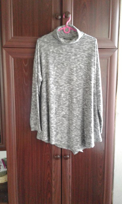 Меланжевый серого цвета лаконичный расклешенный свитер туника с неровным подолом Gina Англия . Батал. Трикотаж мягкий ,хорошо тянется .Длинные рукава со спущенной проймой . Замеры : Ширина плеч- 66 ,ПОГ- 56 ,ПОТ-64 ,ПОБ-84,5 ,Длина максимальная - 84 , Длина минимальная -72 Длина рукава (спущенная пройма)- 46,5 .