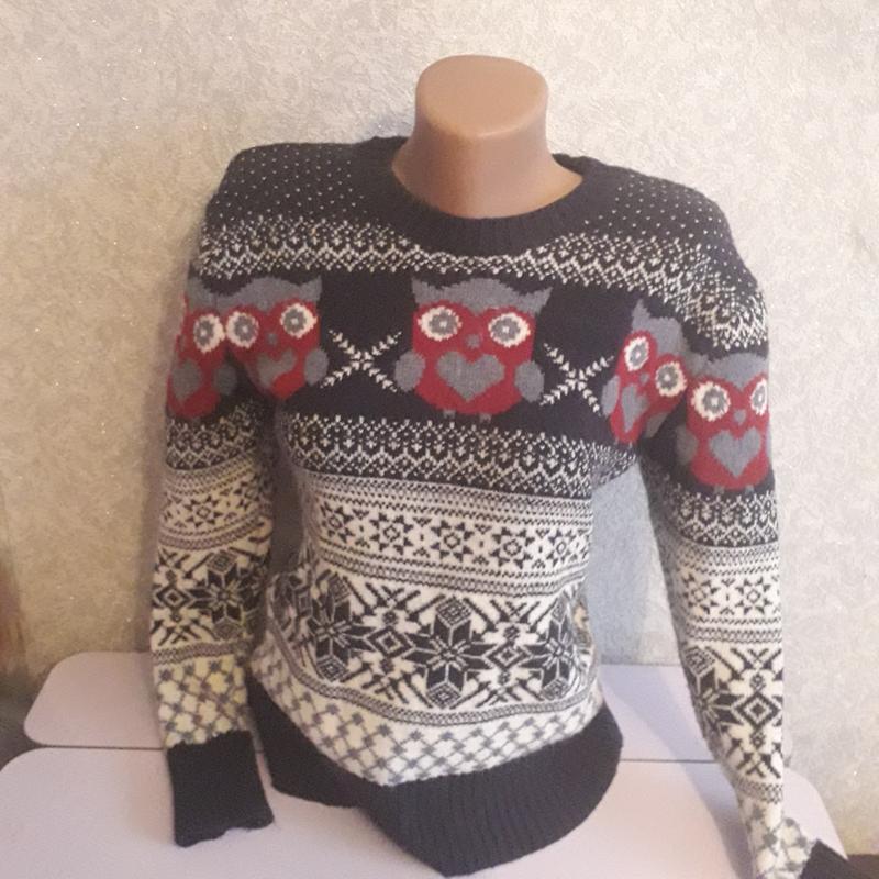 Зимова кофта/светр з совами. Теплюща,плотна шерстяна в'язка. Не секонд. Без дефектів, в корист.була 2 міс десь ПОГ 40 см Довж 57 см рукав 57 см