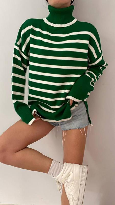 ❄️Акційна ціна ❄️ Улюблені светри-туніки у смужку з горлом 🥰 ▫️Висока фабрична якість ,Туреччина 🇹🇷 ▫️Довжина 72 см ▫️Ширина 66 см ▫️Склад :70% акрил, 30% вовна ▫️Розмір єдиний ▫️Кольори: лише зелений ✨ 880 грн. =780 грн.