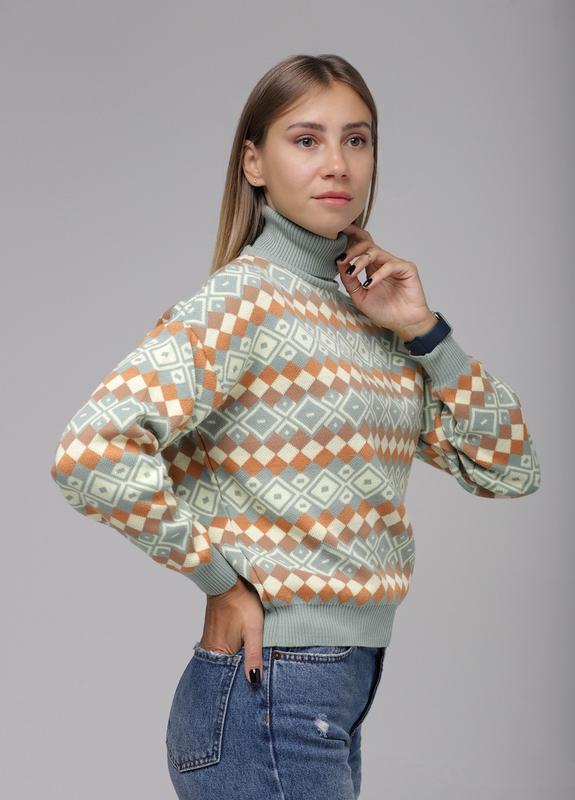 Приємний до тіла светрик з геометричним візерунком, машинної в'язки. Висока горловинка для тих, хто любить затишок. Розмір оверсайз, підійде на 42-46. Виробник- Туреччина, хороша якість. Склад: 50% акрил, 50% котон.