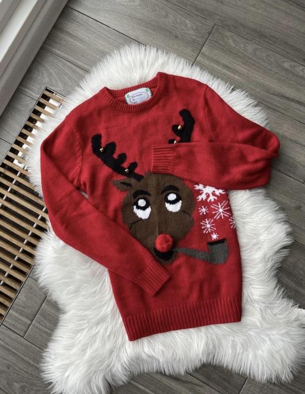 Крутий светр до Нового Року. У оленя на ріжках - дзвіночки. Теплий. Розмір вказаний XS, можеа сміливо на S.