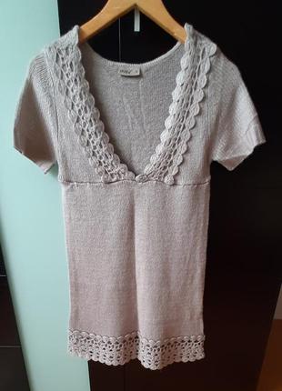 Туніка з корткими рукавами. Спереді і знизу декорована в'язаним круживом, подовжена. Колір коричнево-сливовий. Дуже м'ягенька, приємна на дотик. Стан дуже хороший. Заміри: ПОП 37см ПОГ 39см ПОТ 40см ПОБ 41см ПО по низу 51см Довжина 76см Довжина рукава 21см Півобхват рукава 14/12