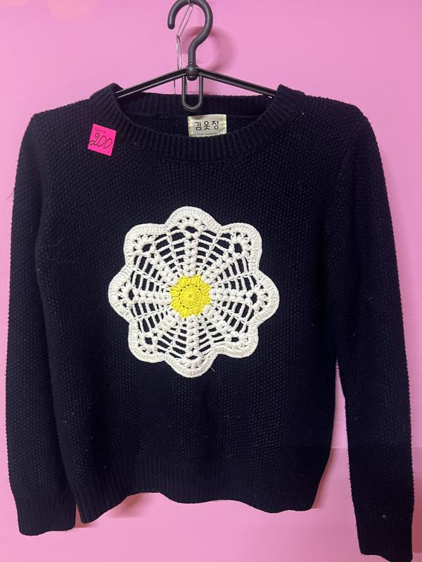 Тепленький свитер с крупной вязкой. Спереди красивая ромашка. Очень мягкий и теплый. Не колется. Состояние идеальное. Размер 42-46.