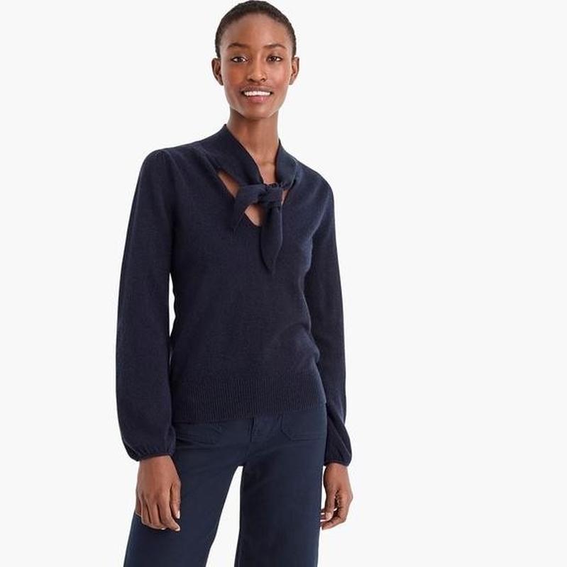 Кашемировый свитер J. Crew, синего цвета с завязкой на шее. По бирке XS но подойдёт и на S-M. Состояние отличное. - пог-44 см - рукав- 63 см -длина от плеча - 59 см
