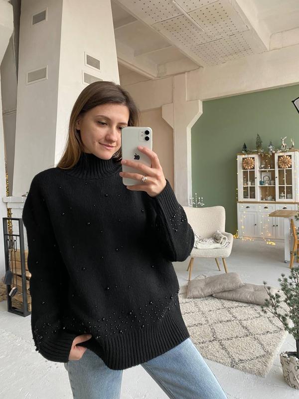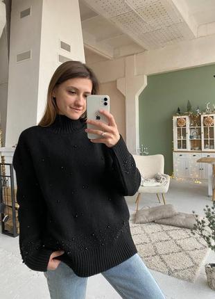 Кофта свитер с бусинами чёрный горлом свободного кроя