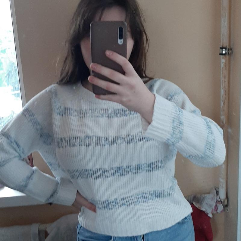 гарна кофтинка, з ніжно голубими смужками(на фото не відображається цей колір), дуже приємний і м'який матеріал, Розмір по бірці L але маломірить Якщо є якісь питання чи потрібні додаткові фото, пишіть😊