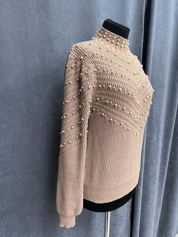 Замечательный свитер с бусинами, красивая вязка. Размер xs, подойдет на s и m. Очень приятный к телу. Состояние очень хорошее