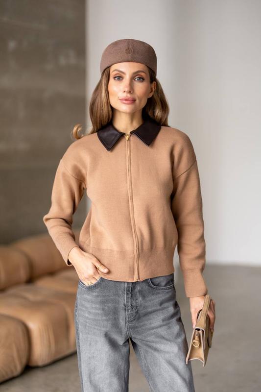 Лаконичная кофта с акцентным кожаным воротником