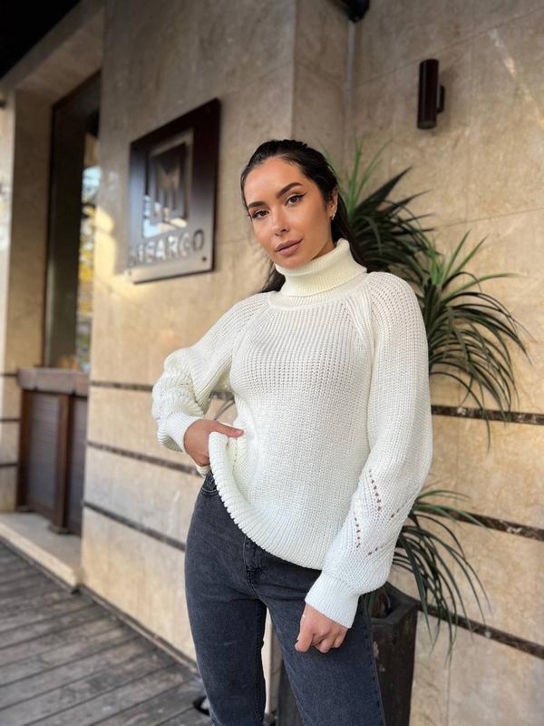 Светрик з горлом Модель 5022 Розмір універсал 42-48 Склад 30% акрил, 70% вовна Кольори: джинс, зелений, лаванда, молоко, пудра Заміри виробу в лежачому стані: - довжина 60 см; - ширина 48-56 см; - довжина рукава від горловини 67 см ModN