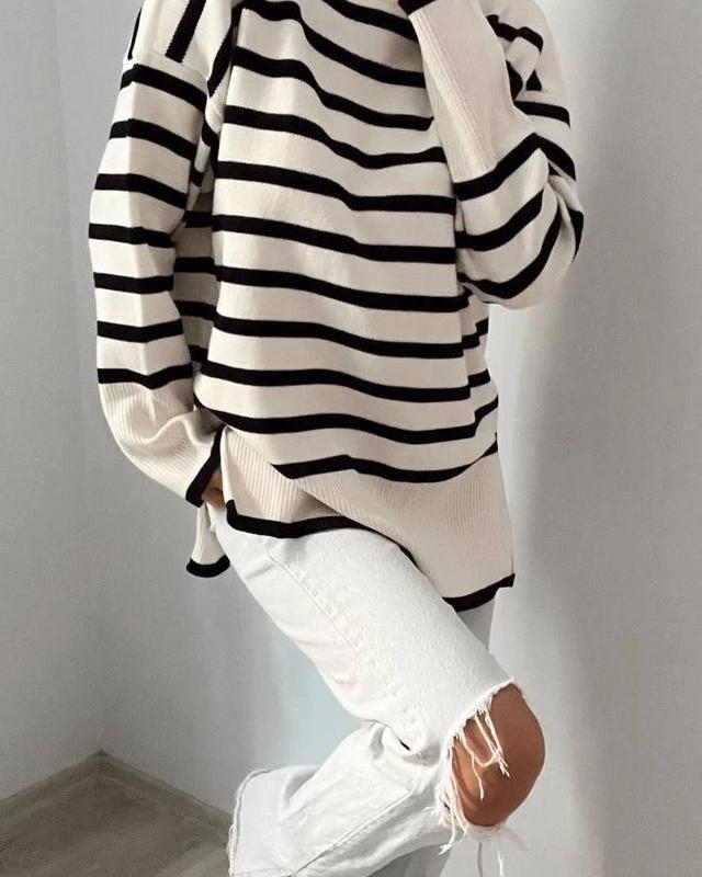 Улюблений подовжений светр оверсайз у смужку. Чудова якість 💥 Топ продажів 2023 Реал фото👌 # 0182-4661 ▪️Виробник Туреччина 🇹🇷 ▪️Колір: чорний та білий ▪️Розмір єдиний 42-46 ▪️Склад тканини:Акрил 70%, Вовна 30% ▪Ціна 690 грн🔥🔥🔥 Moda