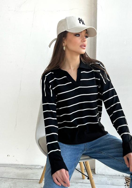 🔝 СВЕТР ПОЛО ⠀ 🛍 Цена : 640 грн ⠀ 🔘Артикул: B1406/62 🔘Тканина: тонка в’язка Состав: 50% коттон, 50% акрил 🔘Размер: 42-46 (единственный) 🔘Цвет: черный, белый 📏 Замеры: ОГ - до 108 см Длина - 55-57 см Длина рукава - 70 см ✍️ Легкий весенний джемпер в тоненькую полоску с воротником - поло 🚚 Отправка товара: ПН., СР., Суб.,