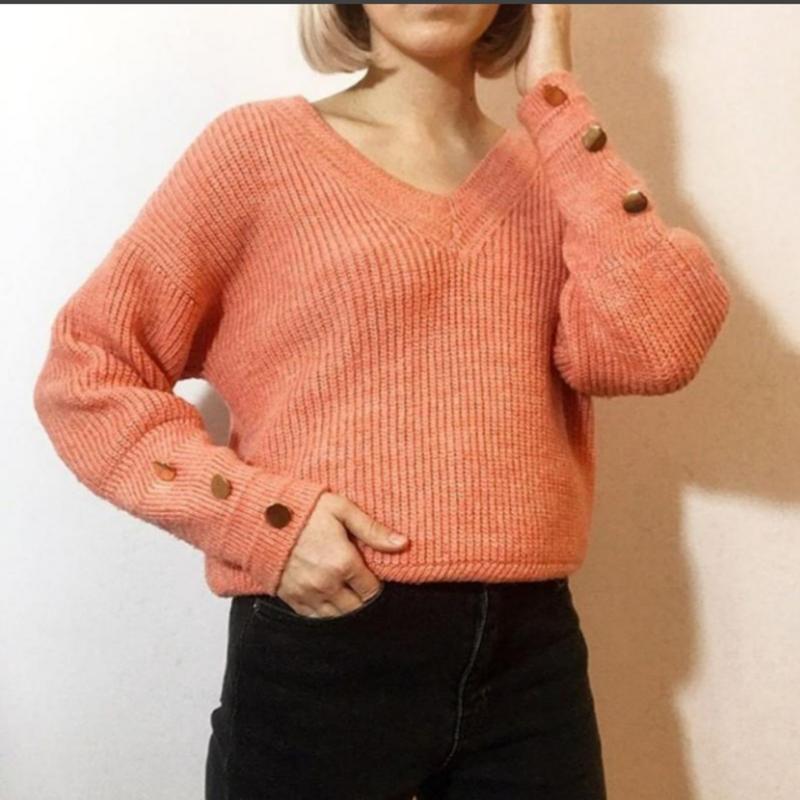 Нежный джемпер из коллекции Per una от Marks & Spenser с V-образным вырезом и актуальными пуговицами на рукавах Размер М Цвет лососевый