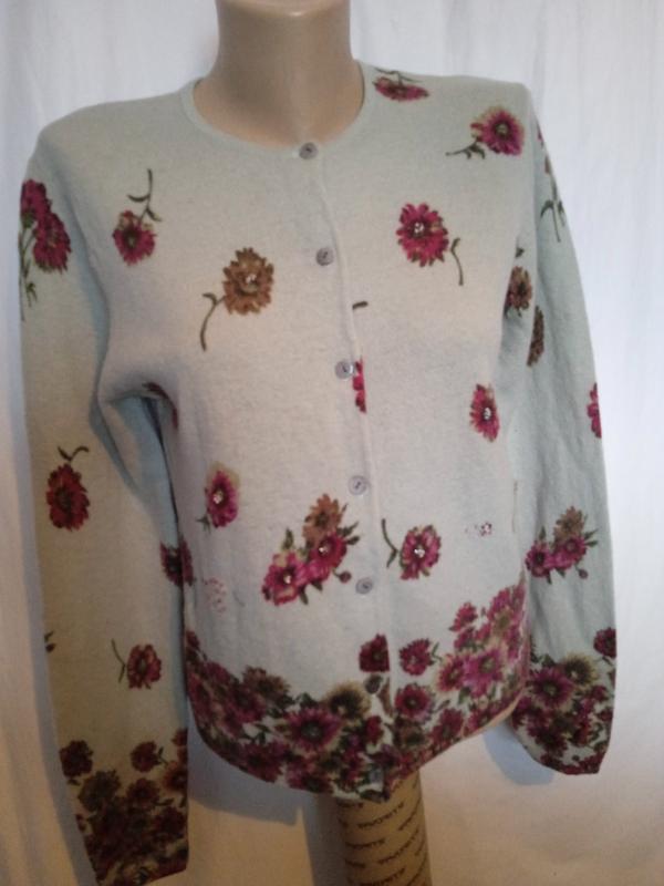 свитерНАТУРАЛЬНЫЙ,100%шерсть, мягкий в цветах на светосером поле, длина 57,рукав64, пог50в спокойном состоянии и тянется примерно54см,ширина по низу46 тянется50
