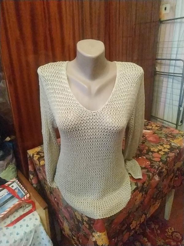 очень красивый вязанный свитер с V-образным вырезом.Смотриться очень красиво.Размер с,м. описание состояние отличное длина 62 пог 41 рукав 64