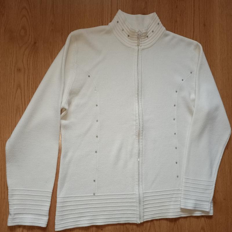 Женская белая кофта, на декоративной с камушками молнии. Длина 60см, длина рукава 58см, Ног 53. Состав: 50% шерсть, 30% акрил, 20%