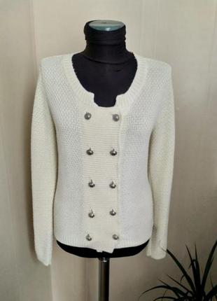 Свитер молочного цвета, размер S-М. Можно носить как свитер, так и как жакет, пуговицы растегивают. Длина 58см, длина рукава 67см, ширина от плеча до плеча 39см, ПОГ 45см. Состав указан на фото! Смотрите другие Мои объявления, много хороших и качественных вещей по приятным ценам!!