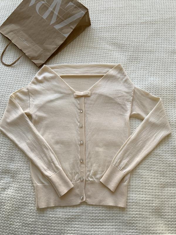 Очень красивый свитерик, чрезвычайно женственная, в нем Вы будете выглядеть элегантной пани Верх идет на приспущенные плечи, пуговицы декорированы в виде кристаллов Цвет Шампань Стан новой вещи, не покошенная (есть нюанс, выходи внизу от магнитика магазина, завышелась небольшая проемка, которую зашита, в носке незаметная) Размер XS-S (смотрите замеры) Пог 39 см Длина 54 см Рукав 52 см По дополнительным замерам или фото пишите