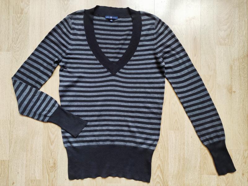 Брендовый свитер в серо-черную полоску. Ткань тонкая, мягкая, гладкая, прекрасного состава. ПОГ - 47 (тянется до 49), рукав - 70 (можно подвернуть), длина от верха плеча - 69. Дефектов нет.